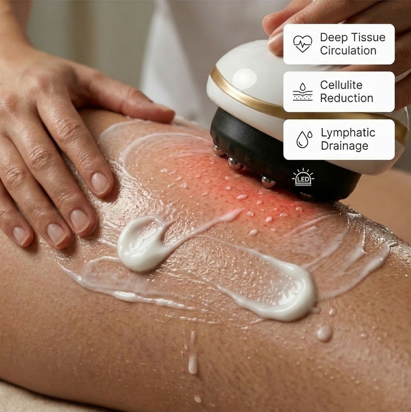 Consistency is key to lasting transformation! We recommend using the device for 5-10 minutes per area, 3-4 times per week. This routine supports continuous circulation and lymphatic flow, keeping your skin looking tight, smooth, and refreshed as part of your regular self-care and body-toning ritual.